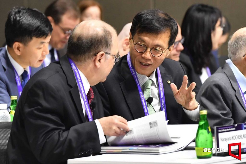 이창용 한국은행 총재가 1일 오전 서울 중구 한국은행 별관에서 '팬데믹 이후의 정책과제(Policy Challenges After the Pandemic)'라는 주제로 열린 2023년 BOK 국제컨퍼런스에 참석해 나라야나 코처라코타 교수와 대화를 나누고 있다. 사진=사진공동취재단