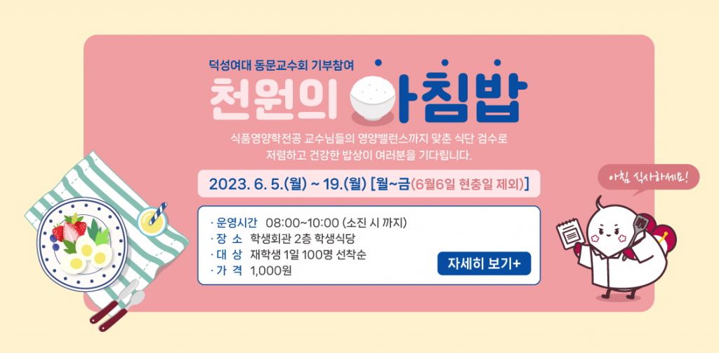 덕성여대는 오는 5일부터 19일까지 보름간 '2023년 천원의 아침밥'을 제공한다고 1일 밝혔다.