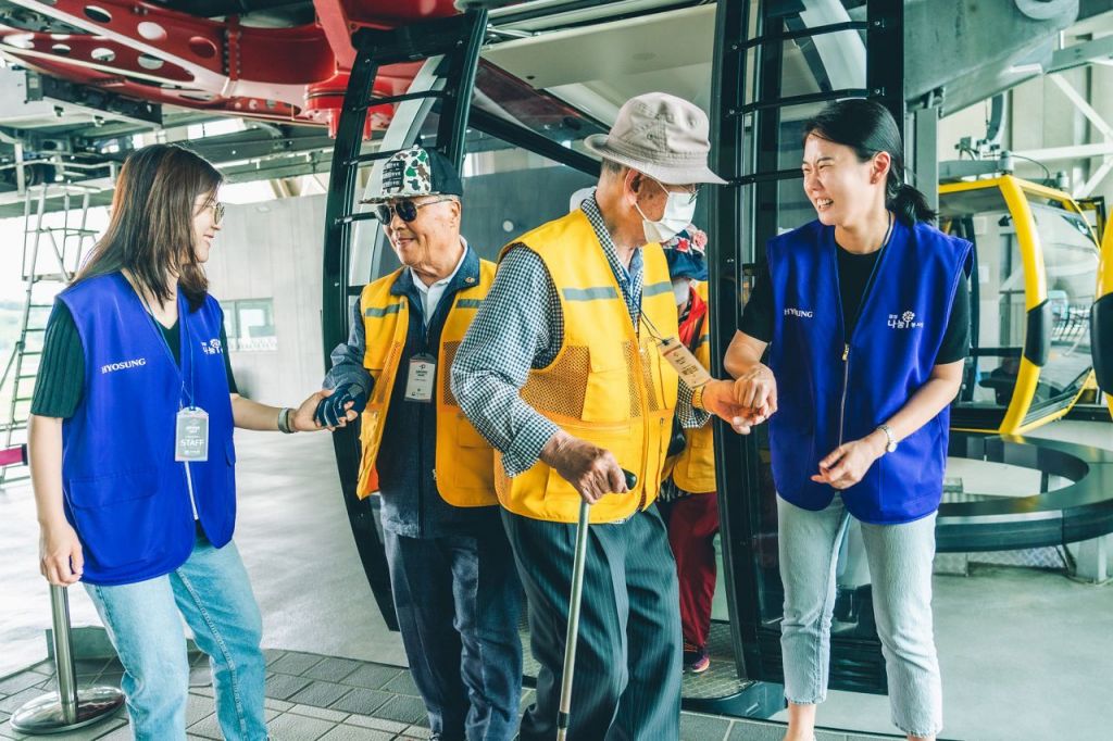 지난달 31일 효성 임직원이 파주 '임진각 평화 곤돌라'에서 내리는 참전유공자를 돕고 있다. [사진제공=효성]