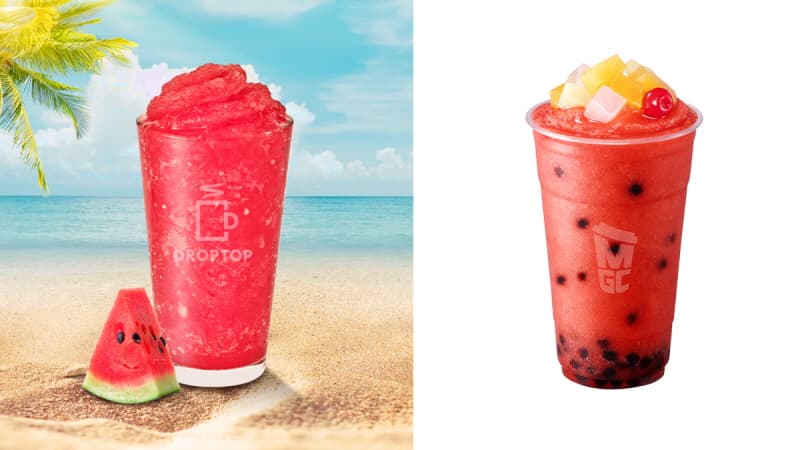 (왼쪽부터) 드롭탑의 여름 시원수박 스무디, 메가커피의 수박화채 스무디. [사진제공=드롭탑, 메가커피]