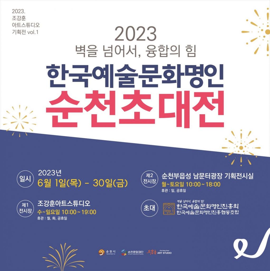 (재)순천문화재단(이사장 노관규)이 수탁 운영하는 순천 창작예술촌 3호 조강훈 아트스튜디오에서 오는 30일까지 ‘2023 한국예술문화명인 순천초대전’이 열린다.