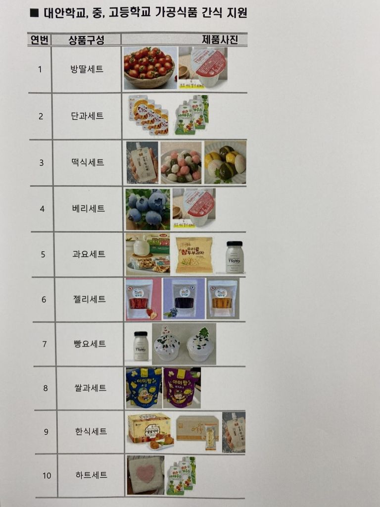 간식은 쌀 가공식품 6개 품목(떡, 식혜 등)과 담양 특산물(방울토마토, 블루베리) 등을 제공해 제조업체 소비 확대와 지역경제 활성화를 도모한다.