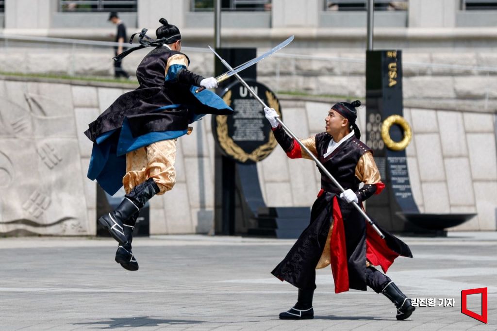 2일 서울 용산구 전쟁기념관에서 국방근무지원단 전통의장대가 전통무예를 선보이고 있다.