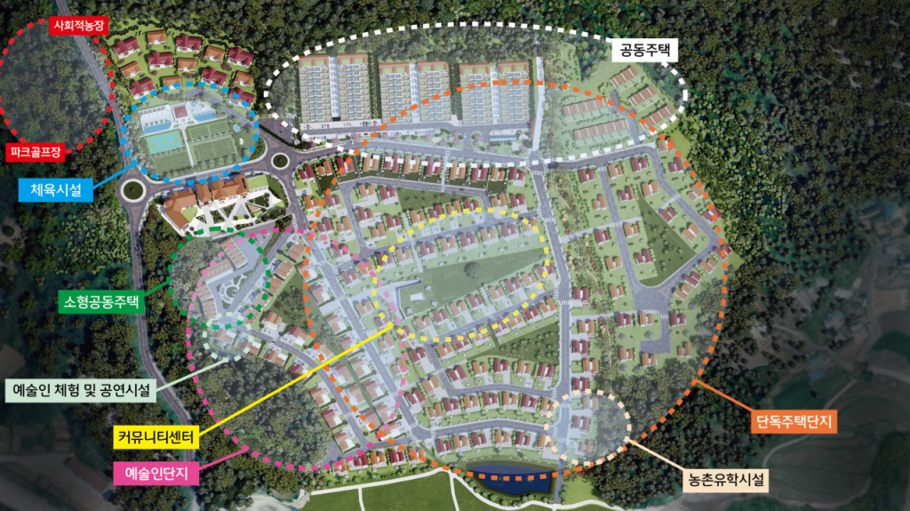 귀농, 귀촌하는 은퇴자를 주 대상으로 500세대의 주거단지와 예술인 특화단지, 농촌유학시설, 커뮤니티시설, 체육시설 등 다양한 기반 시설이 단지 내 조성될 예정이다.