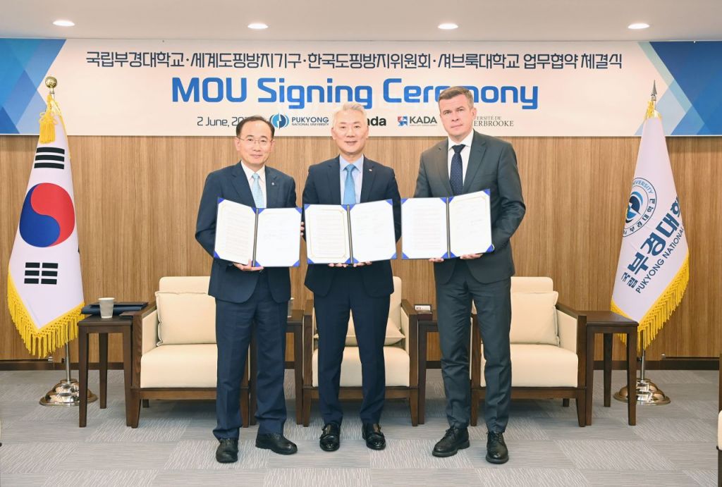 부경대와 한국도핑방지위원회(KADA), 세계도핑방지기구(WADA), 캐나다 셔브룩대학교 도핑방지연구소가 지난 2일 오후 대학본부 3층 총장실에서 업무협약을 체결했다.