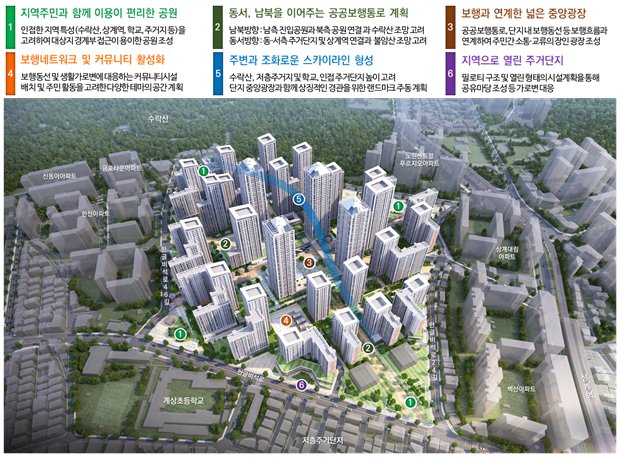 인접한 수락산, 상계역, 학교, 주변 단지와 맞닿을 수 있도록 단지 경계부에 총 4개소의 공원을 배치했다. 또한 상계역, 수락산 등에서 단지로의 접근성을 높이고자 공원부터 단지 중앙광장을 통과하는 동서?남북 방향의 보행동선을 계획했다.