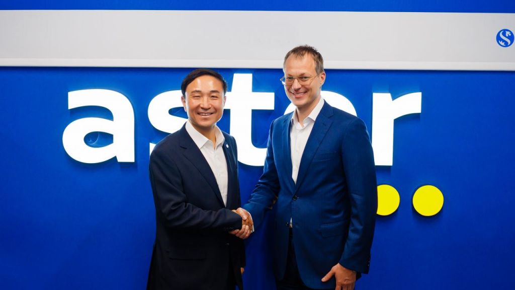지난 2일(현지시간) 문동권 신한카드 사장(왼쪽)이 카자흐스탄 알마티의 아스터오토를 방문해 알렉세이 바칼 아스터 그룹 회장과 기념사진을 찍고 있다.(사진제공=신한카드)