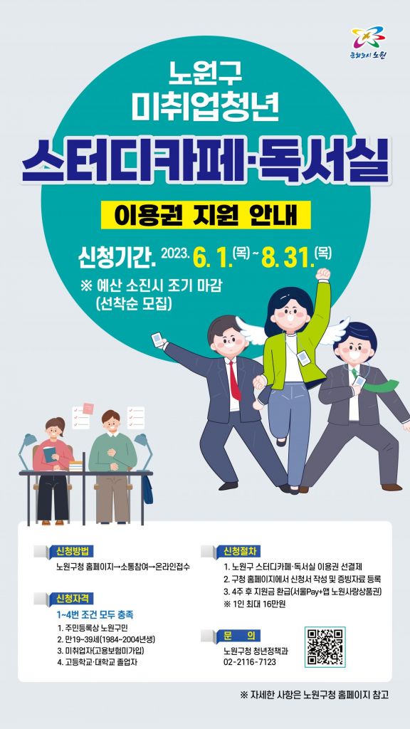 취업 준비를 위해 자주 이용하는 스터디카페·독서실 150시간 상당 이용권 비용(최대 16만 원) 노원사랑상품권으로 환급