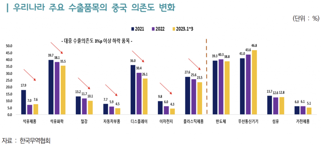 중국 수출 비중이 빠르게 줄어든 품목인 ▲석유제품 ▲석유화학 ▲철강 ▲자동차 부품 ▲디스플레이 ▲이차전지 ▲플라스틱 제품 등에서 중국 외 수출 시장이 커지고 있는 점도 주목 요소다. 석유 제품의 중국 수출 의존도는 2021년 17.9%에서 올해 1분기 7.6%까지 하락했다. 디스플레이는 같은 기간 36.0%에서 26.1%까지 낮아졌다.