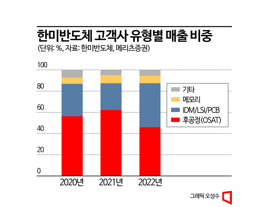 한미반도체는 메모리 대전환을 준비하면서 제2의 도약을 꾀하고 있다. MSVP 의존도를 낮추고 HBM용 TSV TC 본더 장비를 새 성장축으로 키우는 것이다. 한미반도체의 주요 고객사별 매출 비중을 보면 지난 3년간 OSAT가 평균 약 55%로 가장 큰 비중을 차지했다. 메모리 기업 쪽은 한 자릿수에 그쳤다. 2020년 5.8%, 2021년 7.0%, 지난해에도 6.7%에 불과했다.