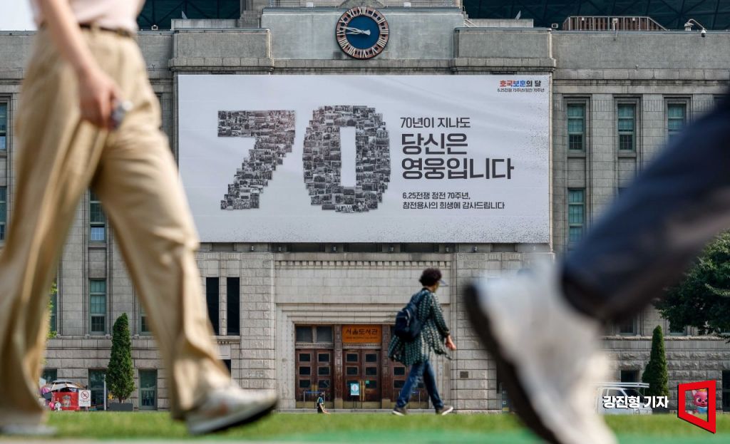 현충일을 하루 앞둔 5일 서울 중구 서울도서관 정면에 150여 장의 6.25 참전용사 사진으로 만들어진 서울시 꿈새김판이 공개되고 있다. 이번 꿈새김판에는 '70년이 지나도 당신은 영웅입니다'라는 문구와 숫자 70(정전 70주년 상징)을 형상화한 6.25 참전용사들의 사진이 담겼다.