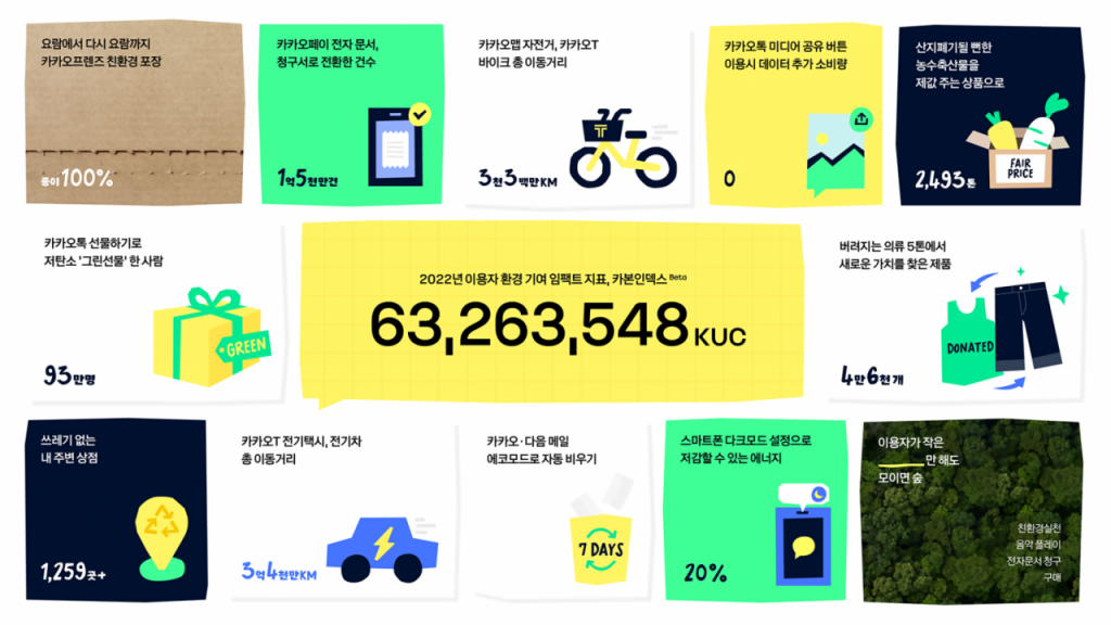 카카오 카본 인덱스는 카카오가 환경 문제 해결을 위해 적극적인 역할을 다하고자 하는 의지를 담아 개발한 지표다. 카카오T 전기 택시와 T 바이크의 이동 거리, 카카오맵 자전거 주행 거리, 카카오페이와 카카오톡 지갑을 통해 전환한 전자문서, 전자청구서 건수, 카카오메이커스 새가버치를 통한 업사이클링 등 이용자가 카카오의 서비스와 플랫폼을 통해 참여한 다양한 친환경 기여 활동을 카카오만의 지수로 계량화했다. 단위는 KUC(Kakao Users’ Carbon-reduction)다. 지난 2022년 이용자들의 온실가스 감축 기여 및 사회적 간접 가치 기여는 총 6300만KUC로 집계됐다. 이는 소나무 약 40만 그루의 탄소 흡수 기여량에 준하는 수준이다.