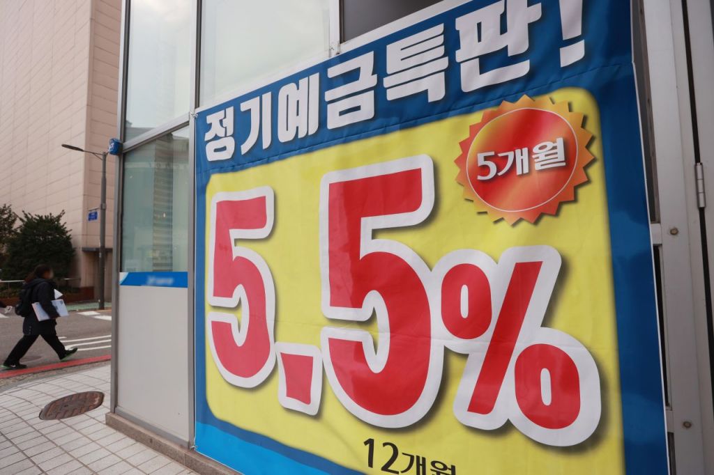 주요 시중은행들이 정기예금 금리를 5%대에서 4%대로 낮춘 9일 서울 한 은행 입구 전광판에 정기예금 금리가 표시돼 있다./강진형 기자aymsdream@
