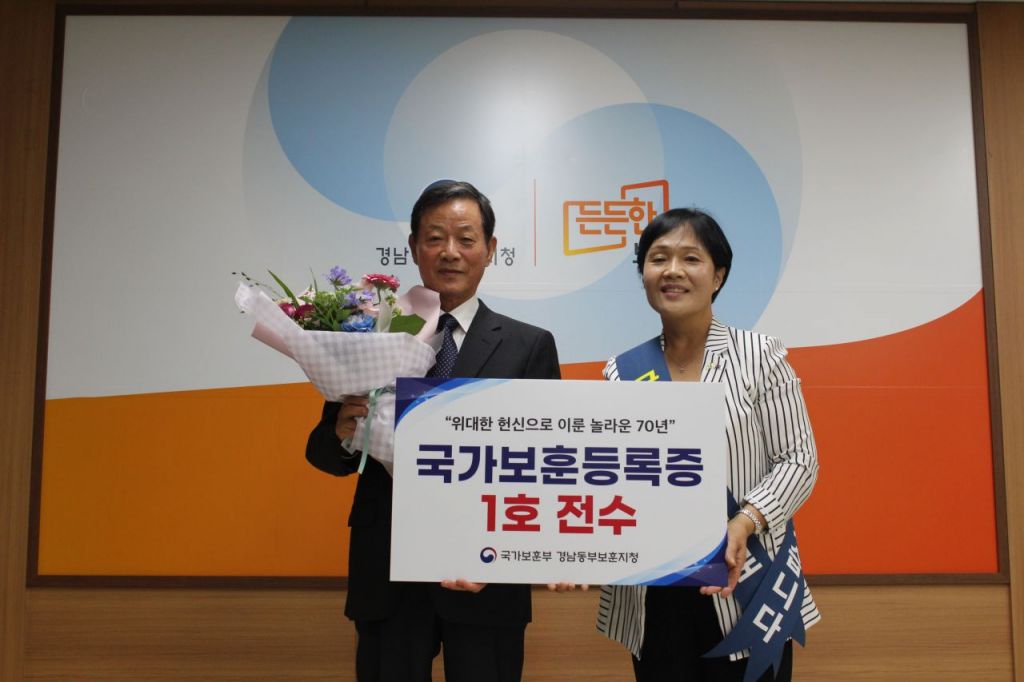 국가보훈부 경남동부보훈지청은 5일 순직군경유족 박정화 씨에게 국가보훈등록증 1호를 발급·전수했다