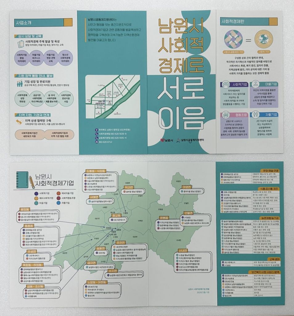 시는 ‘남원시 사회적경제로 서로 이음’ 지도 1000부, ‘남원시 사회적경제 가이드북’ 300부를 사회적경제기업 창업·전환 등을 희망하는 지역 주민, 마을 공동체, 기업체에 배부하고 누구나 쉽게 활용할 수 있도록 할 계획이다.