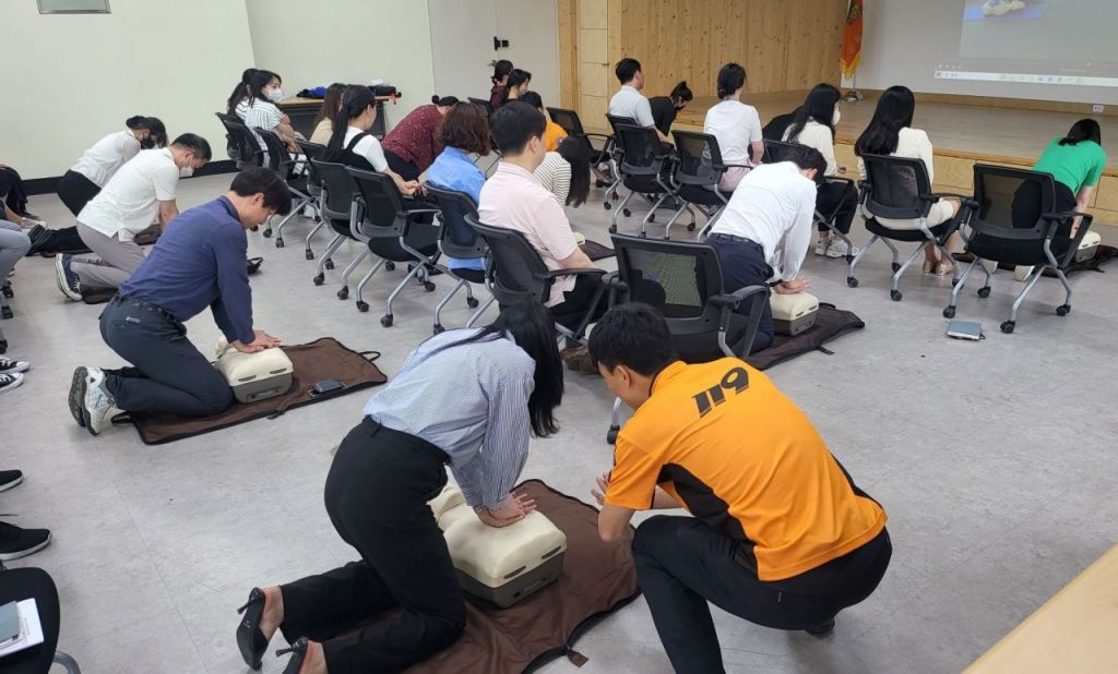 JT저축은행 임직원들이 경기 분당소방서에서 심폐소생술 교육을 진행하고 있다. 사진제공=JT저축은행