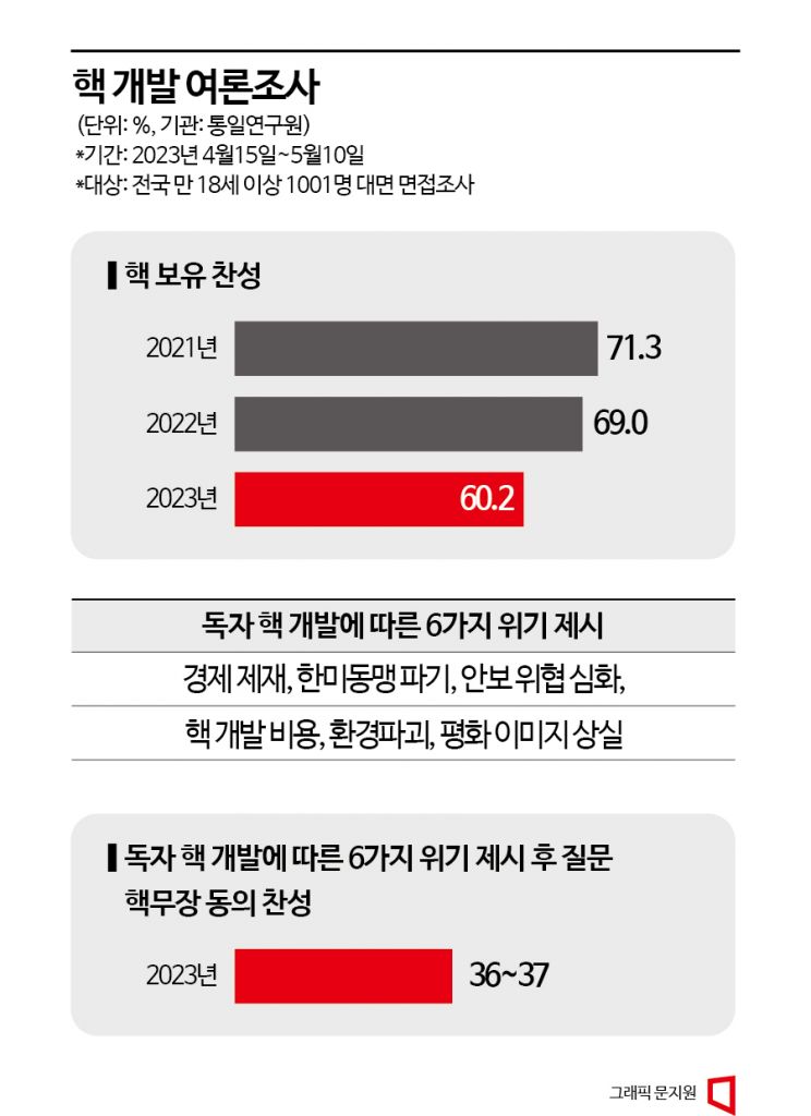 핵 보유 찬성 여론이 과반으로 나타났지만, 독자적인 핵 개발 추진에 따라 직면할 수 있는 6가지 위기(경제 제재·한미동맹 파기·안보 위협 심화·핵 개발 비용·환경파괴·평화 이미지 상실)를 제시한 뒤엔 지지 의견이 36~37% 수준으로 하락했다. 핵 개발에 나설 경우 이 같은 6가지 위기가 발생할 가능성에 대해 동의한다는 답변은 모두 60%를 웃돌았고, 특히 '환경파괴' 우려에 대해서는 79.1%가 수긍했다. 핵 개발 추진으로 수반되는 위기에 관한 질문은 올해 조사에 새롭게 반영된 것이다.