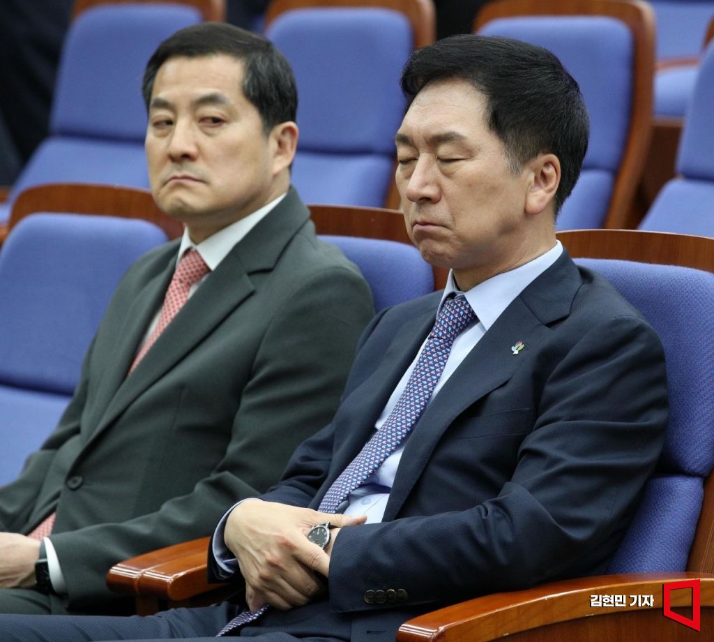 김기현 국민의힘 대표가 5일 국회에서 열린 긴급 의원총회에서 생각에 잠겨 있다. 사진=김현민 기자 kimhyun81@