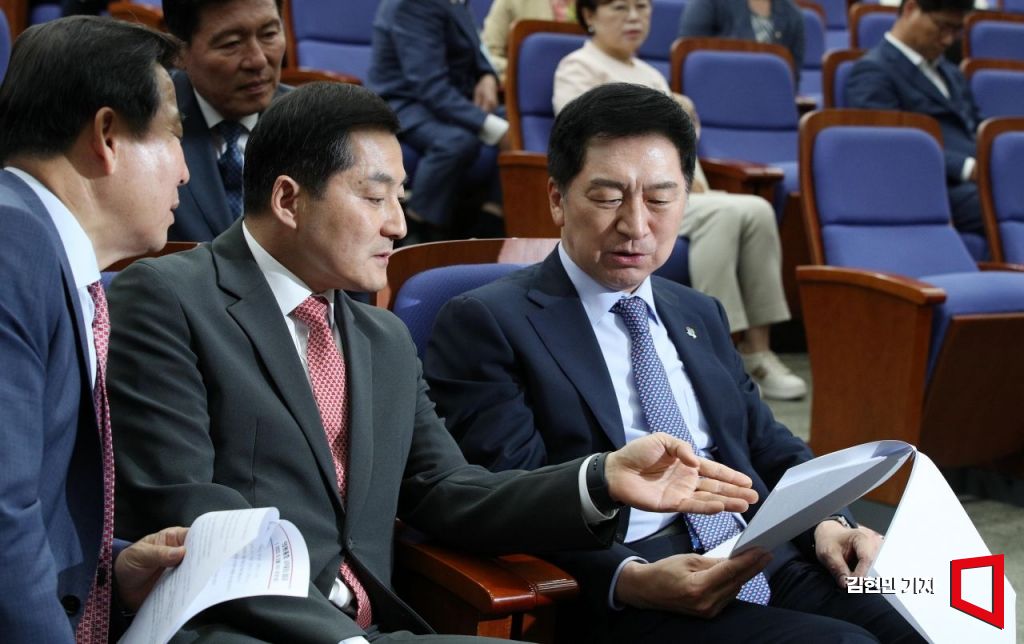 김기현 국민의힘 대표가 5일 국회에서 열린 긴급 의원총회에서 박대출 정책위의장과 대화하고 있다. 사진=김현민 기자 kimhyun81@