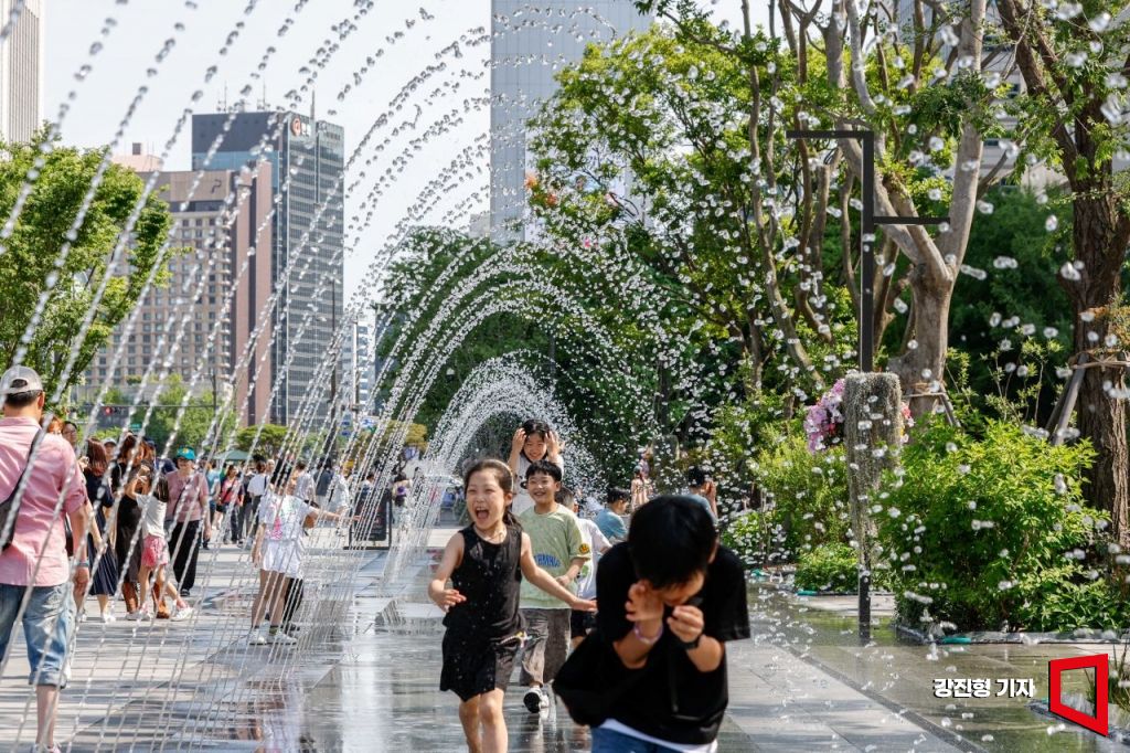 서울 한 낮 최고기온이 25도까지 상승하며 초여름 날씨가 이어지고 있는 5일 서울 종로구 광화문 광장을 찾은 어린이들이 물놀이를 하며 더위를 식히고 있다.