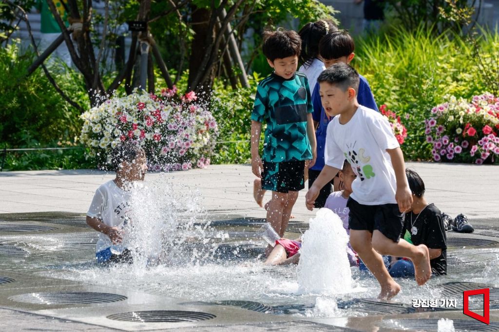 서울 한 낮 최고기온이 25도까지 상승하며 초여름 날씨가 이어지고 있는 5일 서울 종로구 광화문 광장을 찾은 어린이들이 물놀이를 하며 더위를 식히고 있다.