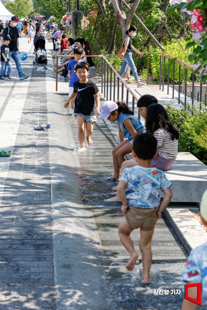 서울 한 낮 최고기온이 25도까지 상승하며 초여름 날씨가 이어지고 있는 5일 서울 종로구 광화문 광장을 찾은 어린이들이 물놀이를 하며 더위를 식히고 있다.