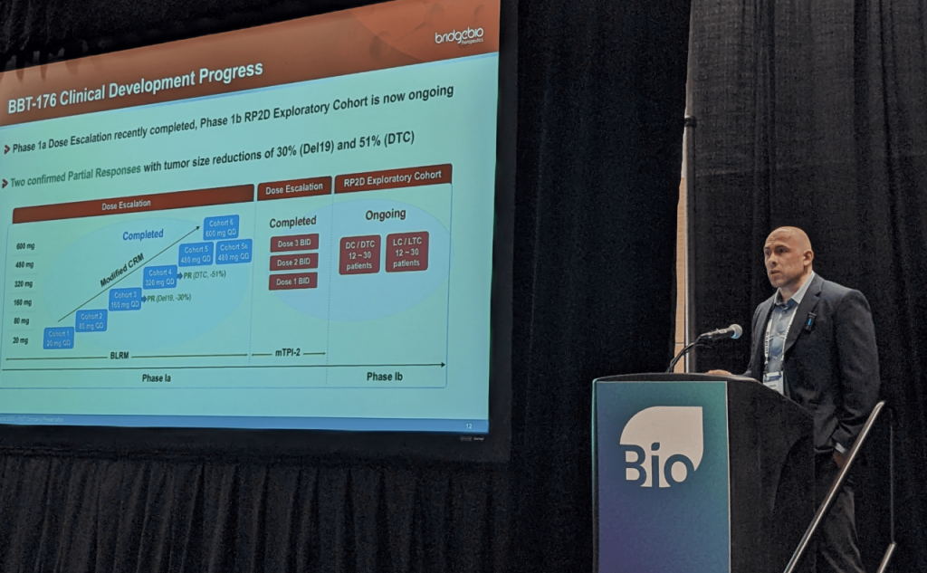 브릿지바이오테라퓨틱스는 비소세포폐암 치료에서 널리 사용되고 있는 타그리소 등 3세대 상피세포 정상인자 수용체(EGFR) 저해제 치료 이후 내성으로 발생할 수 있는 C797S 돌연변이를 표적으로 하는 폐암 과제 2종을 임상 단계로 개발 중이다. 앞선 단계로 개발 중인 'BBT-176'은 임상 1상의 추가 확장 시험군을 통해 임상 2상 진입을 위한 준비와 동시에 글로벌 사업개발의 근거 데이터를 축적해나가고 있다고 회사 측은 설명했다. 이와 함께 독자적으로 발굴한 1호 후보물질인 'BBT-207'은 최근 미국 식품의약국(FDA)으로부터 임상 1/2상 진입을 위한 임상시험계획(IND)을 승인받았다.