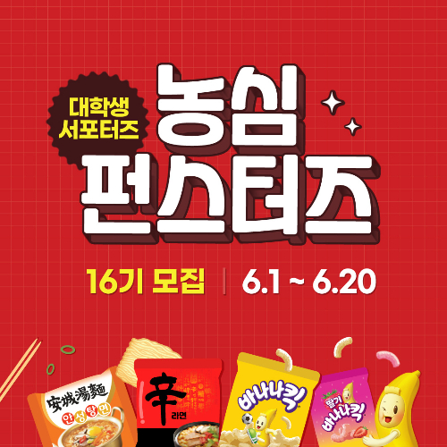 농심 펀스터즈는 농심 제품을 사랑하는 대학생이라면 누구나 지원할 수 있다. 콘텐츠 기획을 맡을 ‘일반’ 분야와 콘텐츠 제작을 담당할 ‘디자인’ 분야 중 하나를 선택해 접수하면 된다. 서류 접수는 오는 20일까지 농심 홈페이지에서 가능하며, 서류와 면접전형을 거쳐 7월 최종 인원이 선발된다.