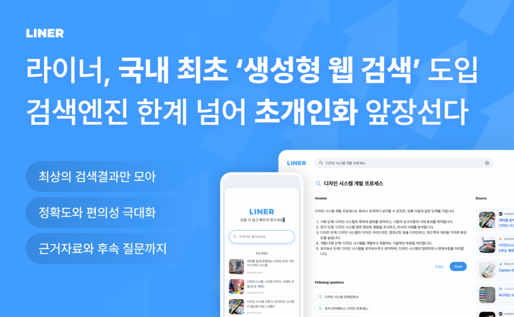 인공지능(AI) 검색 플랫폼 스타트업 라이너는 생성형 웹 검색 서비스를 출시했다고 7일 밝혔다. [이미지출처=라이너]