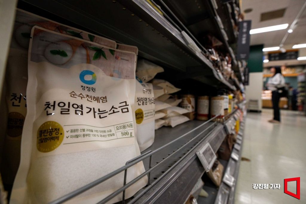 일본 원전 오염수 방류 계획에 따라 천일염에 대한 관심이 급등하며 사재기 움직임이 나타나고 있는 7일 서울 한 대형마트에서 소금을 판매하고 있다.