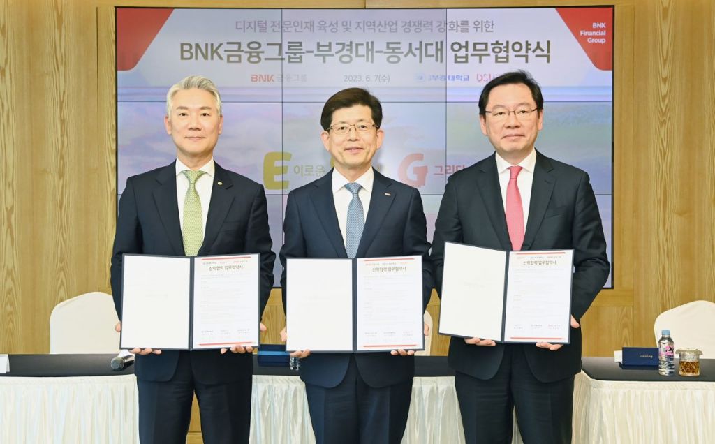 국립부경대학교와 BNK금융그룹, 동서대학교가 7일 오후 부산은행 본점 20층 대회의실에서 디지털금융 인재 양성을 위한 글로컬 산학협력 협약을 체결했다.
