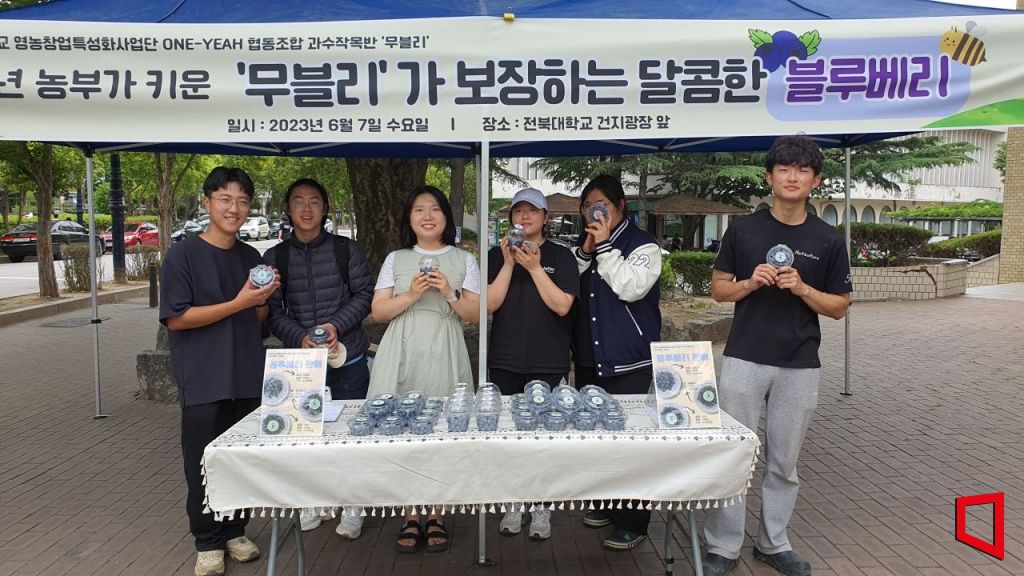 이날 학생들은 전북대 건지광장 부근에 부스를 설치하고 올해 첫 수확 블루베리를 지역 시민에게 판매하고 사업을 홍보했다. 블루베리는 작목반 ‘무블리’가 대학 부속 농장에서 농약과 비료를 사용하지 않고 비닐온실에서 친환경으로 키웠다.