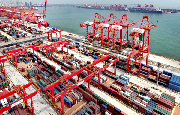 초대형 운반선 정박이 가능한 산둥성 르자오항에 선적을 기다리는 컨테이너가 쌓여 있다. [AP = 연합뉴스]