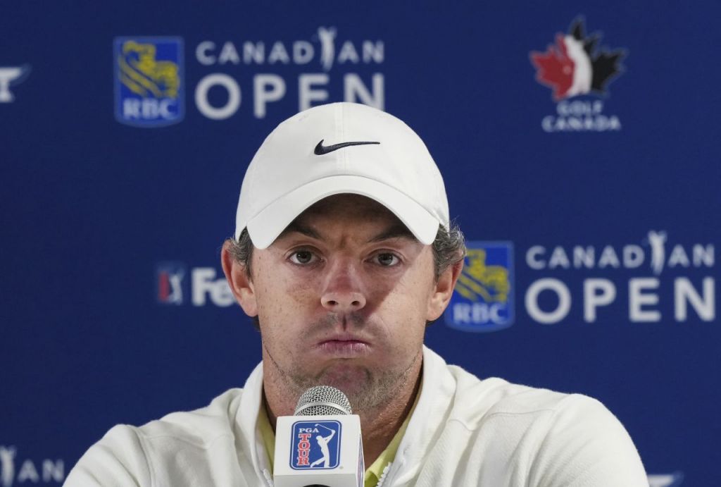 로리 매킬로이가 RBC 캐나다오픈 공식 기자회견에서 PGA투어와 LIV 골프의 합병 관련 질문을 받고 있다.[토론토(캐나다)=AP·연합뉴스]