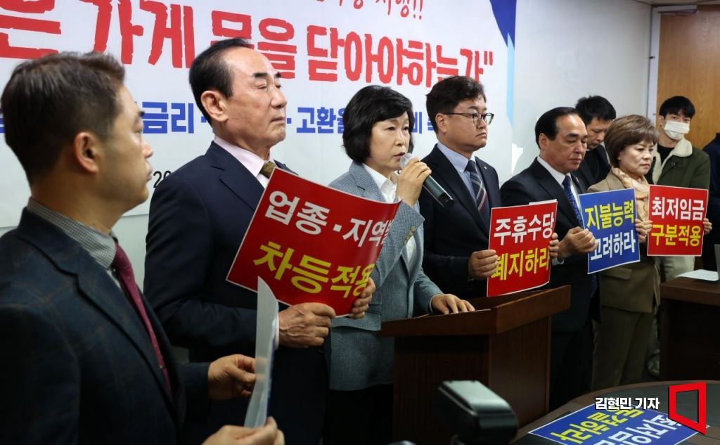 오세희 소상공인연합회장을 비롯한 소상공인들이 2024년도 최저인금 요구안 발표 기자회견을 하고 있다. 사진=김현민 기자 kimhyun81@