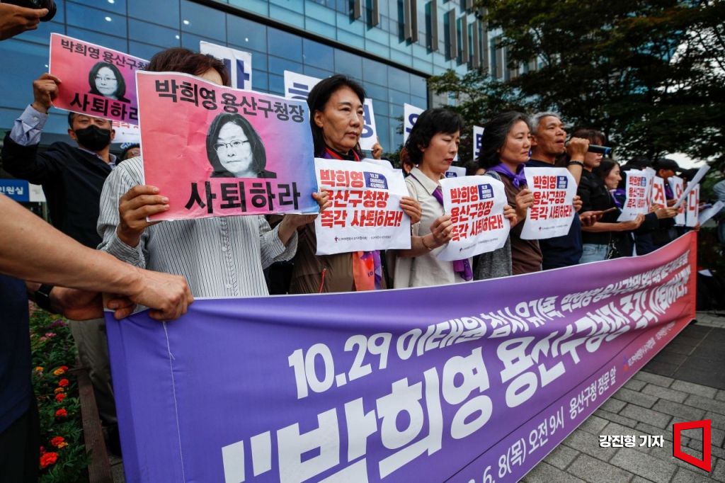 이태원 참사에 부실하게 대응한 혐의로 구속 기소된 박희영 용산구청장이 5개월여 만에 석반된 8일 서울 용산구청 앞에서 이태원참사 유가족들이 박 구청장의 사퇴를 촉구는 기자회견을 하고 있다.