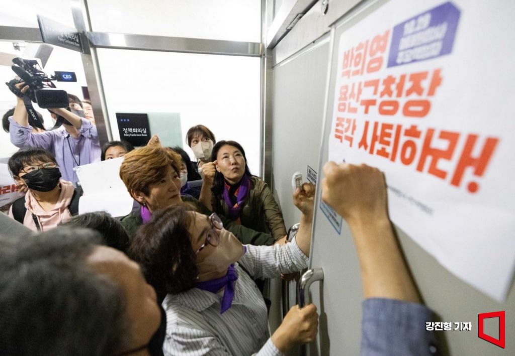 이태원 참사에 부실하게 대응한 혐의로 구속 기소된 박희영 용산구청장이 5개월여 만에 석반된 8일 서울 용산구청 구청장실 앞에서 이태원참사 유가족들이 박 구청장의 사퇴를 촉구하며 구청장실로 진입을 시도하고 있다.