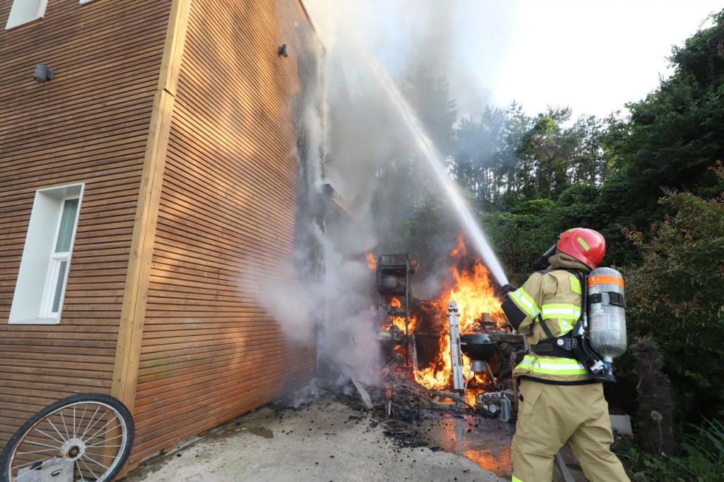 8일 경남소방본부에 따르면 1층 테라스 쪽에서 난 불은 주택 외벽과 집 외부에 있던 집기 등을 태우고 출동한 소방대원에 의해 오후 6시 20분께 꺼졌다.