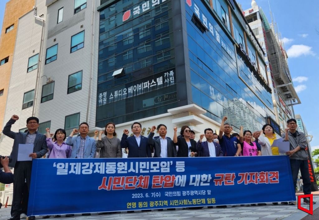 ㈔일제강제동원시민모임 등 82개 광주지역 시민단체는 8일 오후 광주광역시 서구 치평동 국민의힘 광주시당 앞에서 기자회견을 열고 "국민의힘은 시민단체 탈을 쓴 가짜 시민단체를 정상화하겠다면서 '시민단체 때리기'를 본격화하고 있다"고 밝혔다.
