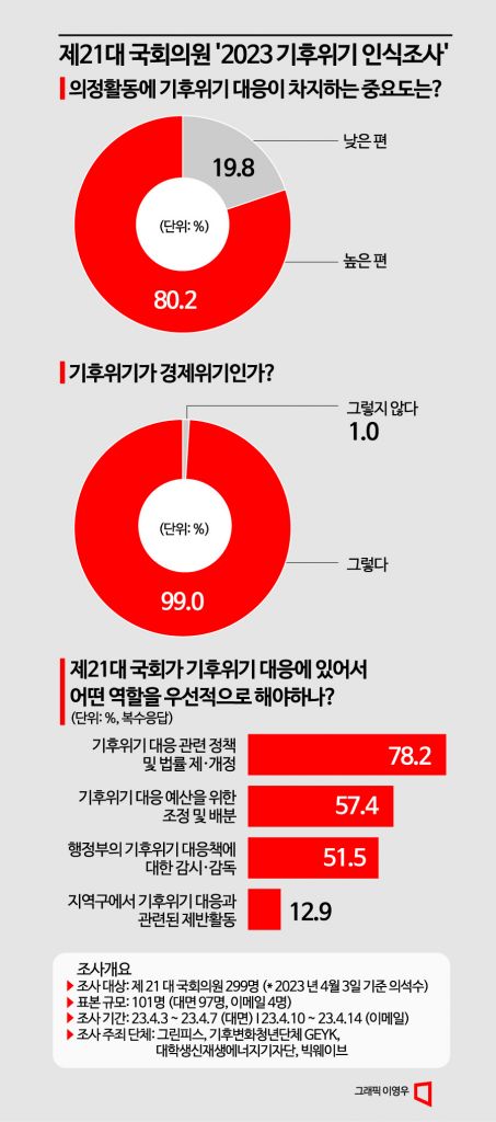 최근 환경단체 그린피스와 빅웨이브 등 국내 청년환경단체는 한국사회여론연구소(KSOI)에 의뢰해 국회의원(299명)을 대상으로 '기후위기 인식 설문조사'를 실시했다. 이 결과 응답자 101명 중 81명(80%)이 '의정활동에서 기후위기 대응이 중요하다'고 답했다. 또 설문에 응답한 국회의원의 99%는 '기후위기는 경제위기'라는데 동의했다.