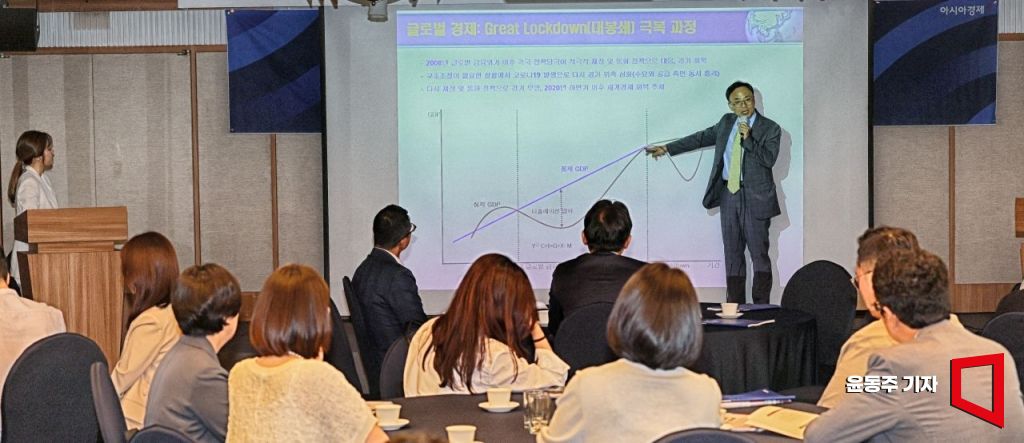 김영익 서강대 경제대학원 교수가 8일 서울 중구 프레스센터에서 열린 '제5회 아시아경제 IPR포럼'에서 '글로벌 금융시장 전망 - 위기와 기회'라는 주제로 강연을 하고 있다. 사진=윤동주 기자 doso7@