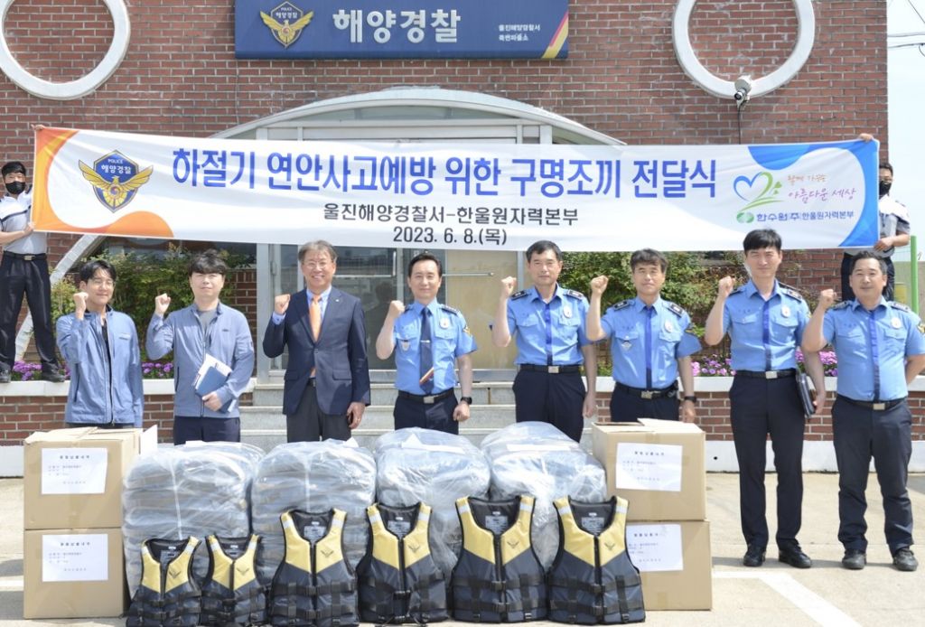 한국수력원자력 한울원자력본부(본부장 박범수)는 8일 울진해양경찰서(경찰서장 최원식)에 이동식 동력소화펌프 2대와 자율대여용 구명조끼 300벌을 전했다.