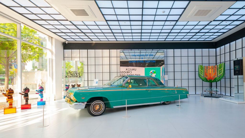 입구에 들어서면 1962년식 임팔라를 화려하게 커스터마이징(맞춤제작) 한 차량이 눈에 띈다. 연한 에메랄드 색상으로 차량 곳곳에 도금한 듯한 포인트를 준 게 특징이다. 차량 커스터마이징을 전문적으로 하는 서우탁 아티스트와 협업했다. 서씨가 평소 미국 문화를 좋아하는 점을 반영, 실내에는 나이키 신발과 야구 배트를 일부러 뒀다고 한다. 한국GM이 만드는 트랙스 크로스오버도 바로 옆쪽에 전시돼 있다. 미국에서는 수요가 많지만 아직 국내에선 고객에게 인도하지 않은 피스타치오 카키 색상 모델이다. 벽면은 화려한 LED 영상이 나온다.