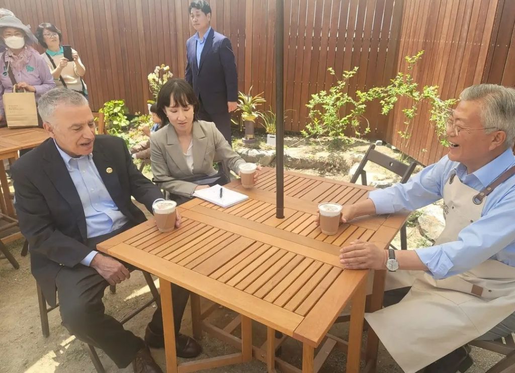 지난달 25일 필립 골드버그 주한 미국 대사의 평산책방 방문 당시 문재인 전 대통령이 일회용 컵에 든 음료를 마시며 환담하고 있다. [이미지출처=문재인 전 대통령 페이스북 캡처]