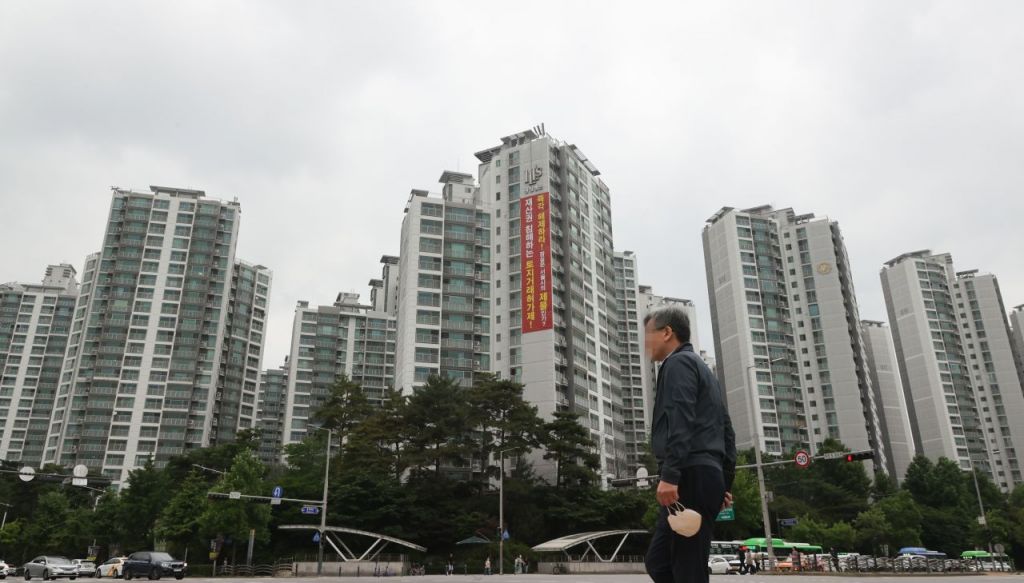 서울 송파구 잠실동에 토지거래허가제 폐지 촉구 현수막이 걸려있는 아파트 모습 [이미지출처=연합뉴스]