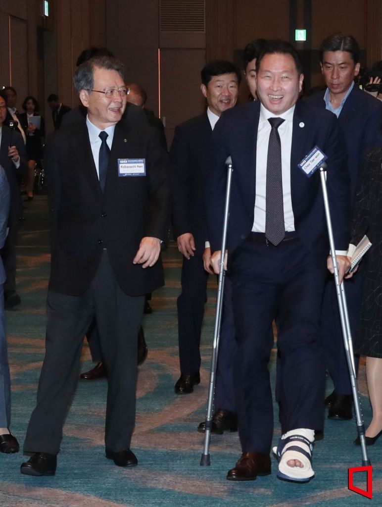 6년 만에 한일 상공회의소 회장단 회의가 9일 열렸다. 최태원 대한상공회의소 회장은 발목 부상에도 회의에 참석했으며 고바야시 켄 일본 상의 회장은 목발을 짚고 이동하는 최 회장에 "천천히 가라"고 배려하는 모습을 보였다.