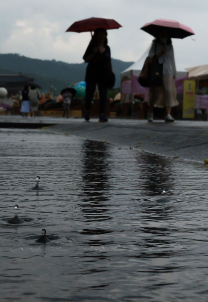 비가 내린 서울 세종대로 광화문광장에서 관광객과 시민들이 우산을 쓴 채 이동하고 있다. [이미지출처=연합뉴스]