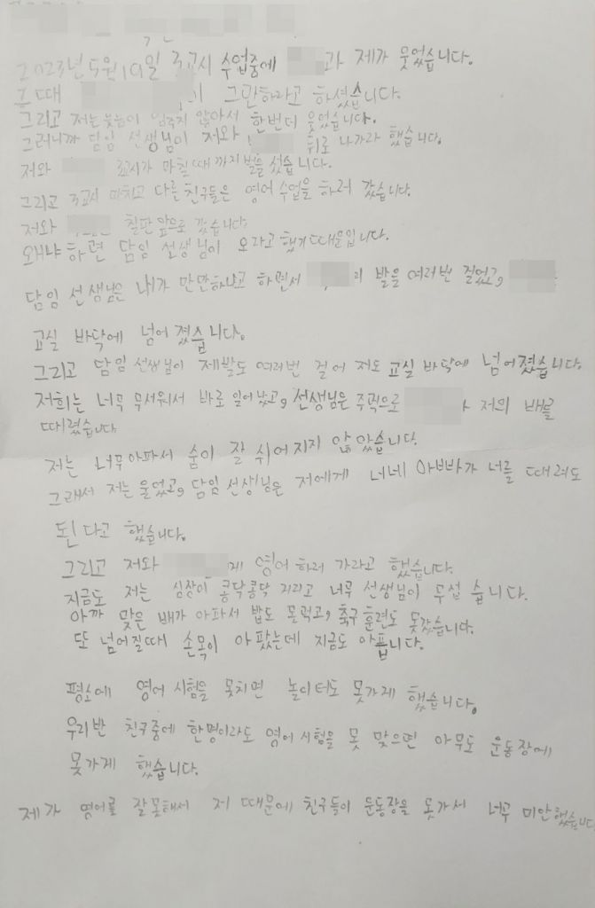 B군은 당시 상황을 담은 글에서 "지금도 심장이 콩닥콩닥거리고 선생님이 너무 무섭다"며 "맞은 배가 아파서 밥도 못 먹고, 축구 훈련도 못 갔다. 또 넘어질 때 손목이 아팠는데 지금도 아프다"고 했다.