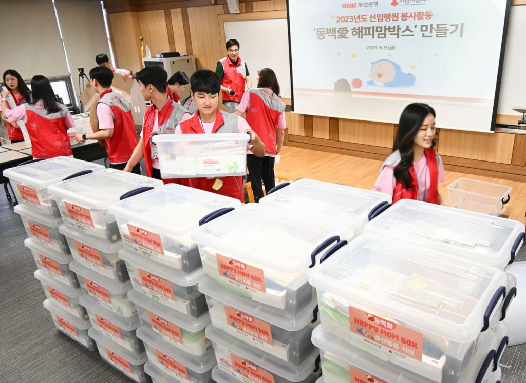 부산은행 연수원에서 2023년 부산은행 신입 연수생 42명이 직접 제작한 ‘해피맘박스’는 기저귀와 온습도계 등 20만원 상당의 총 12가지 출산·육아용품으로 구성됐다.