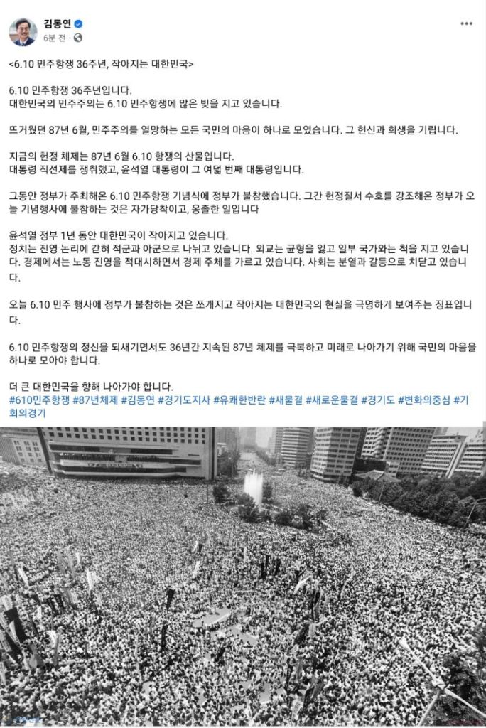 김동연 지사는 "오늘 6ㆍ10 민주 행사에 정부가 불참하는 것은 쪼개지고 작아지는 대한민국의 현실을 극명하게 보여주는 징표"라며 "6ㆍ10 민주항쟁의 정신을 되새기면서도 36년간 지속된 87년 체제를 극복하고 미래로 나아가기 위해 국민의 마음을 하나로 모아야 한다"고 강조했다.